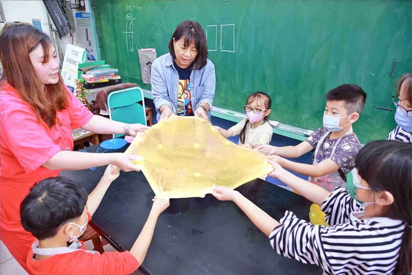 第一次摸到史萊姆的孩子們無不感到驚奇:「哇!好神奇!冰冰涼涼的,還能拉得這麼長!」