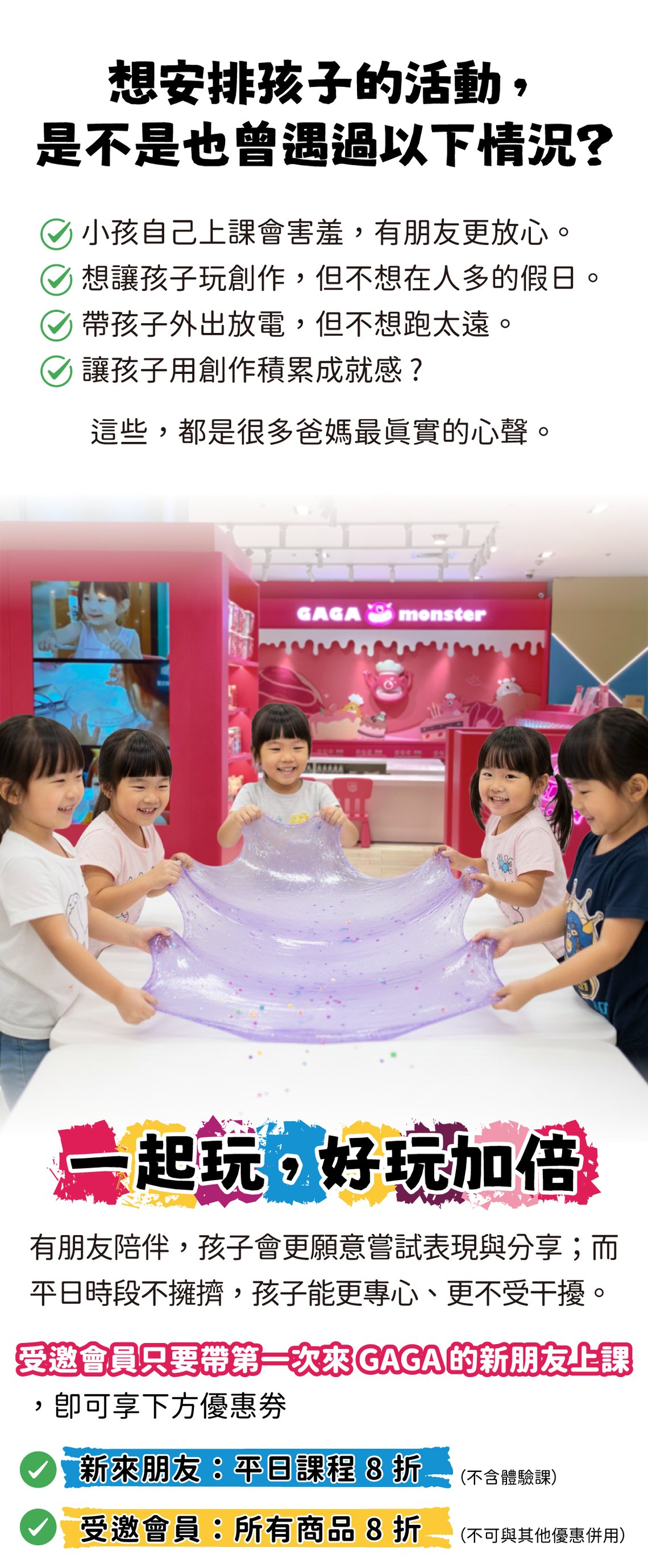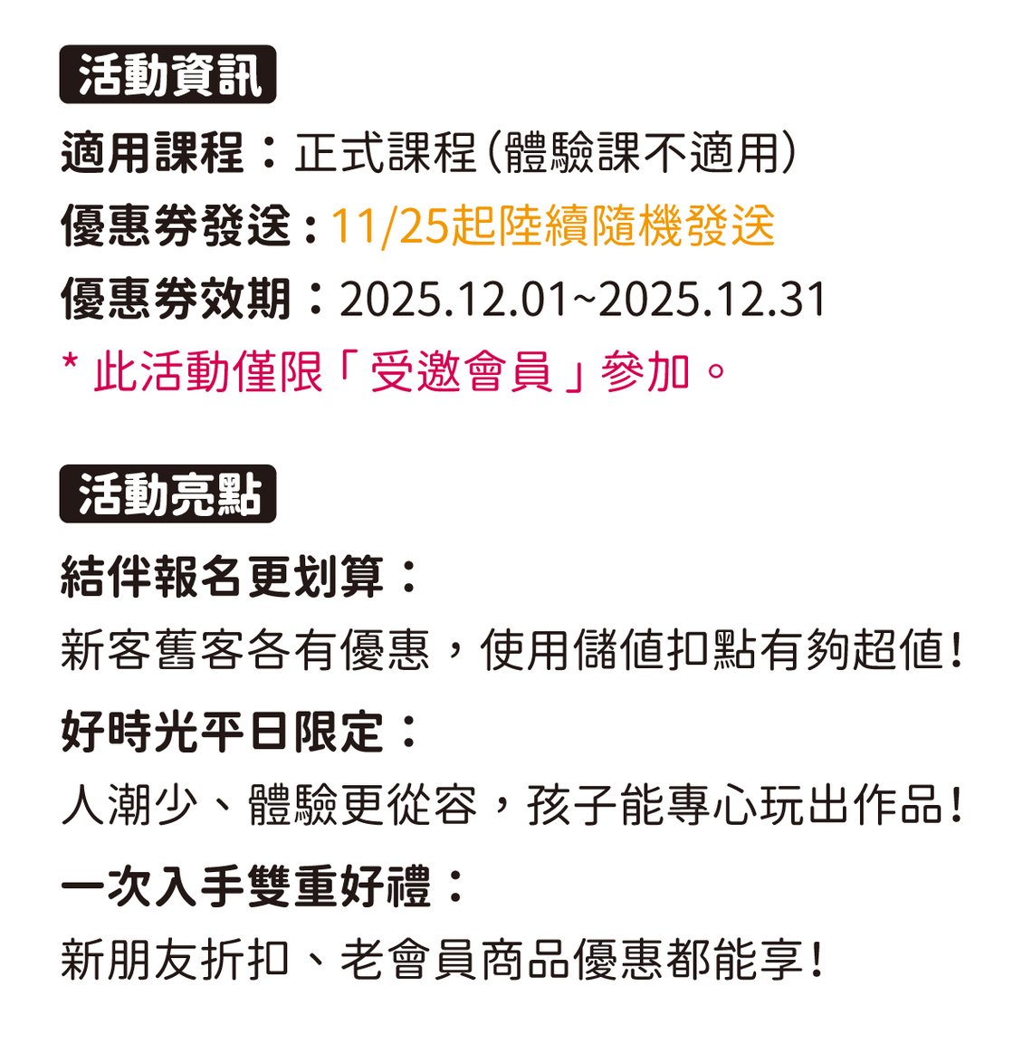 • 優惠內容:新朋友當次上課享 8 折優惠,8折商品券只要在有效期限前使用即可。 *小小怪獸創造課不包含其中