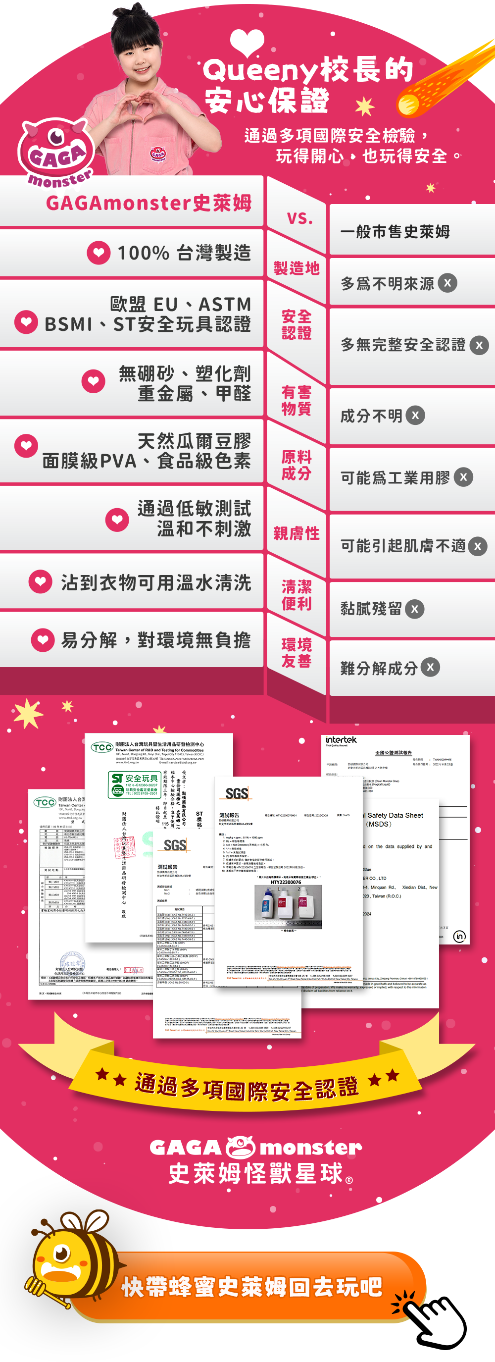 A:GAGA史萊姆已通過SGS安全認證,完全不含硼砂、重金屬等有害物質,讓孩子玩得更安心。幾歲以上可以玩?需要家長陪同嗎?